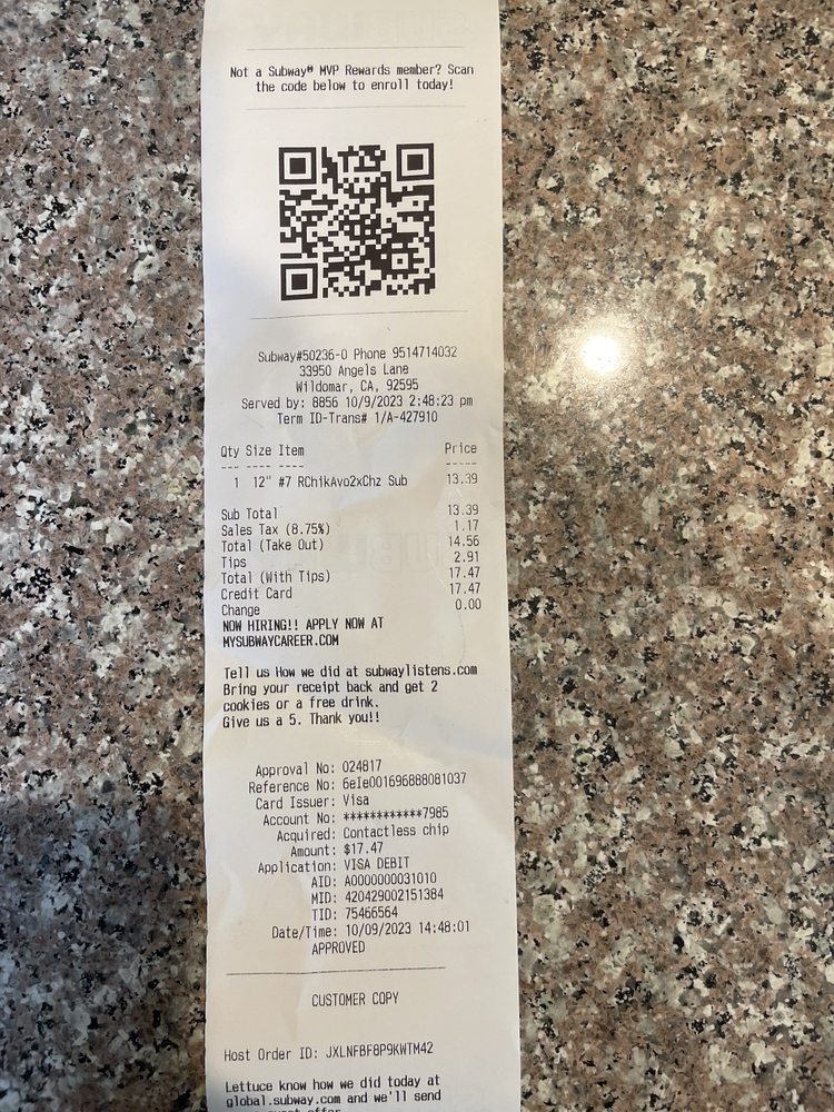 Welcome to Subway Wildomar, where every sandwich tells a delicious story! Located at 33950 Angels Ln, this charming eatery boasts a diverse menu that caters to all tastes. Whether you're in the mood for the classic Cold Cut Combo® or the hearty Rotisserie-Style Chicken, each sub is crafted with fresh ingredients. For those craving a little adventure, the Spicy Nacho Chicken provides a delightful kick, while the Ultimate B.M.T.® serves up bold, comforting flavors.